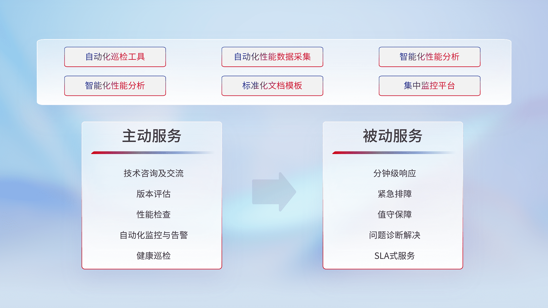 智能化工具和标准化文档,,,,保障服务质量,,提供主动服务(包含技术咨询、、、版本评估、、性能检查、、自动化监控与告警、、、、健康巡检)和被动服务包含(分钟级响应、、、紧急排障、、值守保障、、、问题诊断解决、、SLA服务)。。
